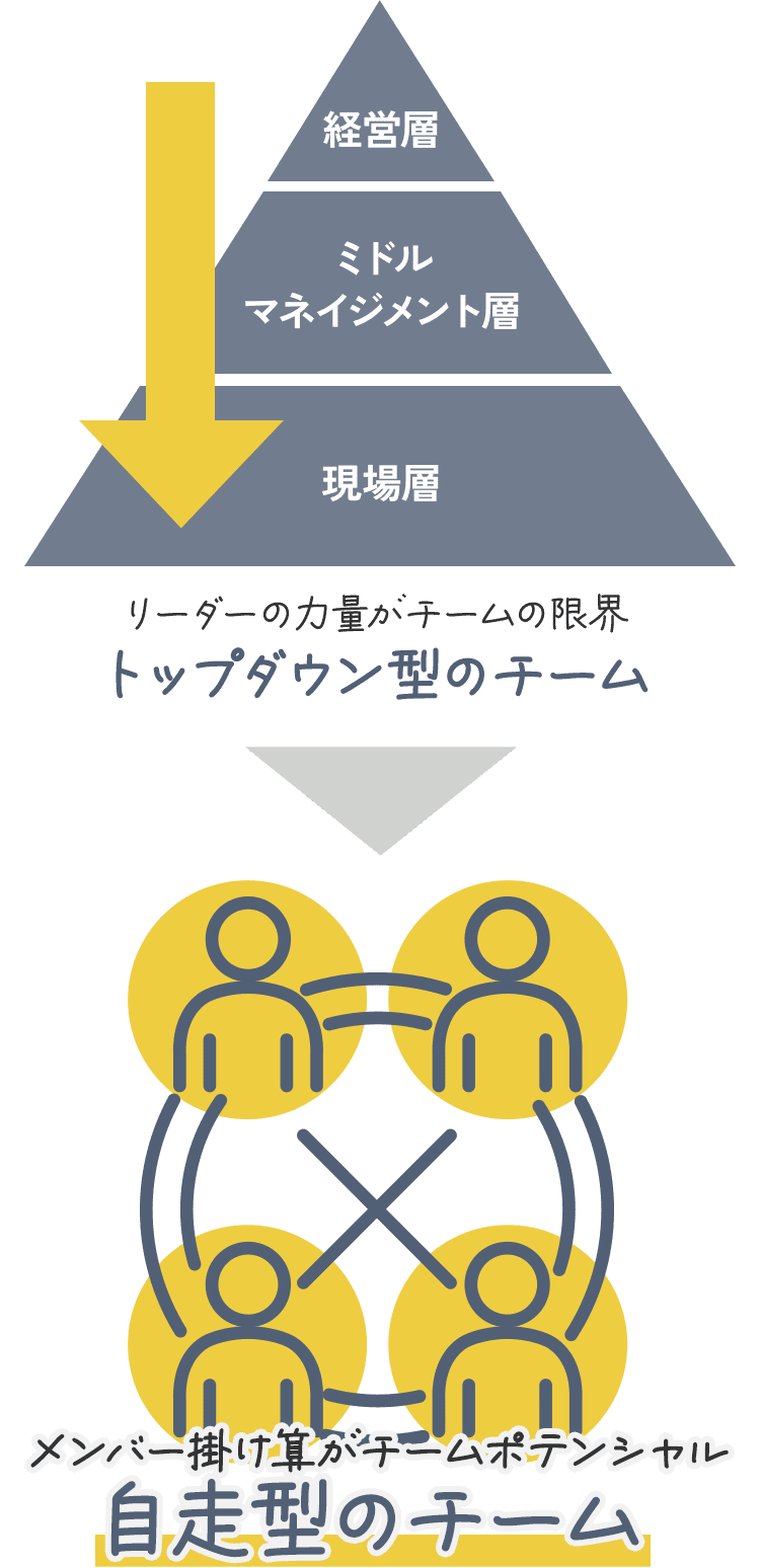 企業では、トップマネジメントやミドルマネジメントが、企業の業績向上と人材育成の両方を成し遂げる重要なポジションにいます。マネージャーを頂点とするトップダウン型のチームは、リーダーの力量が成果に直結するため、多くの企業では、マネジメントを対象とした研修プログラムの採用などマネージャーの能力向上にばかり目が向けられています。しかし、本来であれば、メンバー一人ひとりが自発的に考え動き、マネージャーとメンバー全員の力の総和がチームのポテンシャルとなる自律型組織が理想といえます。COEDASの※BestTeamは、チームに相互信頼を作りより高いパフォーマンスを生み出す自律型組織へとサポートするチーム変革プログラムです。